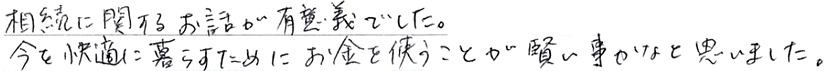 相続に関するお話が有意義でした。今を快適に暮らすためにお金を使うことが賢い事かなと思いました。- 横浜市50代女性