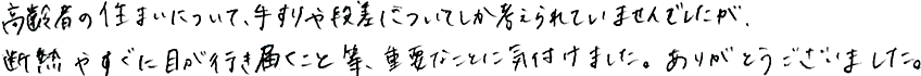 高齢者の住まいについて、手すりや段差についてしか考えられていませんでしたが、断熱やすぐに目が行き届くこと等、