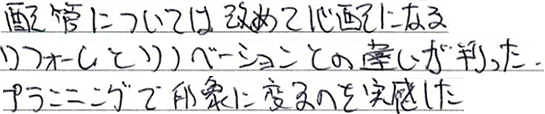 配管については改めて心配になる。リフォームとリノベーションとの違いが判った。プランニングで印象が変わるのを実感した。- 目黒区60代男性