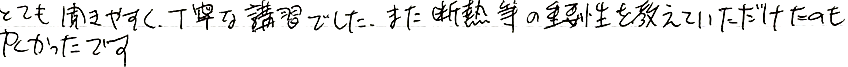 とても聞きやすく丁寧な講習でした。また断熱等の重要性を教えていただけたのも良かったです。- 渋谷区40代男性