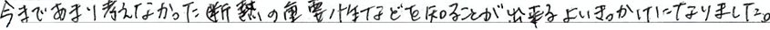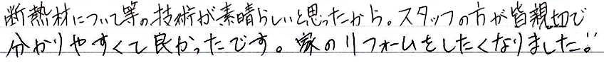 断熱材について等の技術が素晴らしいと思ったから。スタッフの方が皆親切で分りやすくて良かったです。