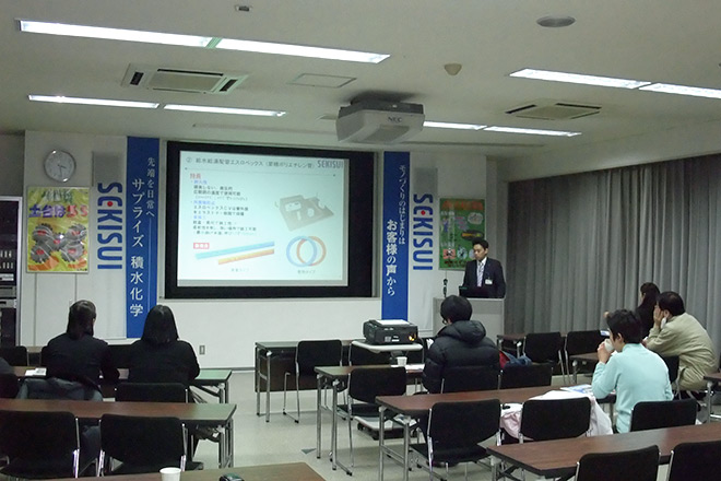 現場マンションの集会場で、施工責任者から見学前に概要説明。